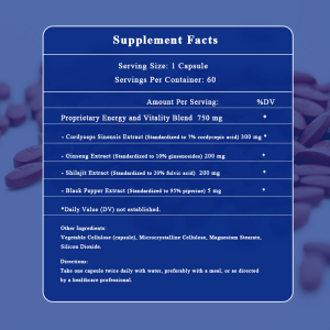 This Cordyceps, Ginseng, and Shilajit nutritional supplement is designed to support energy levels, enhance physical performance, and promote overall vitality. Cordyceps Sinensis Extract, standardized to 7% cordycepic acid, boosts energy, enhances endurance, and supports respiratory function. Ginseng Extract, standardized to 10% ginsenosides, improves physical performance, reduces fatigue, and supports mental clarity. Shilajit Extract, standardized to 20% fulvic acid, enhances energy production and supports overall well-being. Black Pepper Extract improves the absorption of active ingredients.