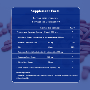 This Elderberry nutritional supplement is designed to support immune function, enhance overall well-being, and promote antioxidant activity. Elderberry Extract, standardized to 10% anthocyanins, is known for its immune-boosting properties. Vitamin C and Zinc provide additional immune support and promote overall health. Echinacea and Astragalus Root Extracts enhance immune function and help the body fight off infections. Ginger Root Extract provides anti-inflammatory benefits. Black Pepper Extract improves the absorption of active ingredients.