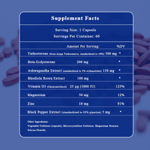 This Turkesterone nutritional supplement is designed to support muscle growth, enhance strength and endurance, and promote overall well-being. Turkesterone, derived from Ajuga Turkestanica, is a potent adaptogen known for its ability to enhance muscle protein synthesis. Beta-Ecdysterone further supports muscle growth and recovery. Ashwagandha and Rhodiola Rosea extracts help reduce stress and improve physical performance. Vitamin D3, Magnesium, and Zinc support bone health, immune function, and overall metabolic processes. Black Pepper Extract improves the absorption of active ingredients.