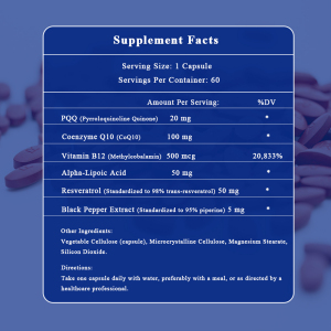 This PQQ nutritional supplement is designed to support mitochondrial health, enhance energy production, and promote overall well-being. PQQ is known for its ability to support the growth of new mitochondria and enhance cellular energy production. Coenzyme Q10 works synergistically with PQQ to further boost mitochondrial function and provide antioxidant protection. Vitamin B12, Alpha-Lipoic Acid, and Resveratrol provide additional support for energy metabolism and antioxidant defense. Black Pepper Extract improves the absorption of active ingredients.