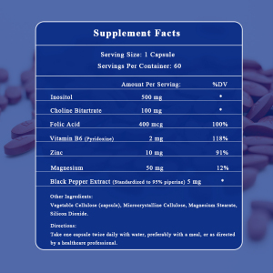This Inositol nutritional supplement is designed to support mood balance, hormonal health, and cognitive function. Inositol plays a key role in cellular signaling and is known for its ability to support mental well-being and hormonal balance. Choline Bitartrate supports brain health and cognitive function. Folic Acid, Vitamin B6, and Zinc provide additional support for hormonal health and overall metabolic function. Magnesium supports relaxation and stress relief. Black Pepper Extract improves the absorption of active ingredients.