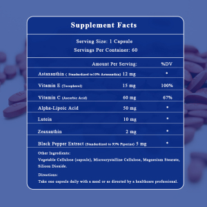 This Astaxanthin nutritional supplement is designed to support skin health, improve antioxidant capacity, and promote overall well-being. Astaxanthin, derived from Haematococcus pluvialis extract, is a powerful antioxidant that helps protect cells from oxidative damage. Vitamin E and Vitamin C enhance the antioxidant effect and support immune function. Alpha-Lipoic Acid, Lutein, and Zeaxanthin provide additional benefits for eye health and skin protection. Black Pepper Extract improves the absorption of active ingredients.