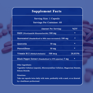 This NMN nutritional supplement is designed to support cellular health, boost energy levels, and promote longevity. NMN is a precursor to NAD+, which plays a crucial role in cellular energy production and metabolism. Resveratrol and Pterostilbene are powerful antioxidants that support cardiovascular health and anti-aging benefits. Quercetin provides additional antioxidant properties and supports immune function. Vitamin B12 enhances energy production and overall metabolic function. Black Pepper Extract improves the absorption of active ingredients.
