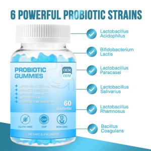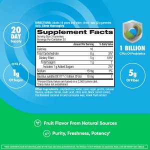 These probiotic gummies are formulated with 1 billion CFUs of *Bacillus subtilis DE111®* per serving, a clinically studied probiotic strain that may help support digestive balance and immune function. Each serving also provides 5g of dietary fiber (18% of the Daily Value) to promote gut health and regularity. Made with natural fruit flavors and no artificial additives, the gummies are an easy and tasty way to incorporate probiotics and fiber into your daily routine. *Key Features:* **Probiotic Support:** Contains 1 billion CFUs per serving to aid gut microbiome health. **Fiber Boost:** 5g of dietary fiber per serving to support digestion. **Clean Ingredients:** Free from artificial colors or preservatives, sweetened with cane sugar and monk fruit extract. *Note:* These statements have not been evaluated by the FDA. This product is not intended to diagnose, treat, cure, or prevent any disease.
