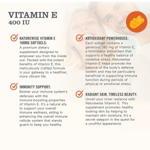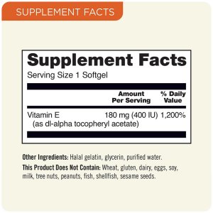 These Vitamin E Softgels provide 180 mg (400 IU) of dl alpha tocopheryl acetate per serving, delivering 1,200% of the daily value for vitamin E. Vitamin E is a potent antioxidant that helps protect cells from oxidative stress, supports healthy skin, and promotes immune function. The softgels are free from common allergens like wheat, gluten, dairy, soy, and nuts, making them suitable for individuals with dietary restrictions.
